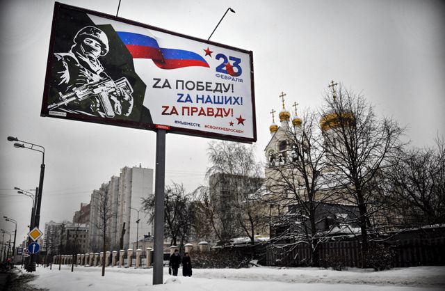 Advertentie voor de Dag van de Overwinning, voor een orthodoxe kerk in Moskou. FOTO ALEXANDER NEMENOV / AFP