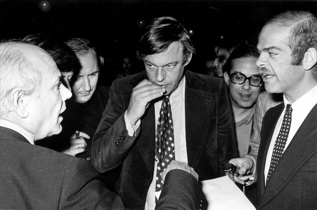 Foto ANPHANS VAN MIERLO (D66), JOOP DEN UYL (PVDA) EN BAS DE GAAY FORTMAN (PPR) BESPREKEN IN 1972 DE VERKIEZINGSUITSLAGEN.