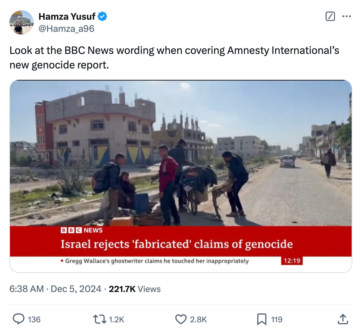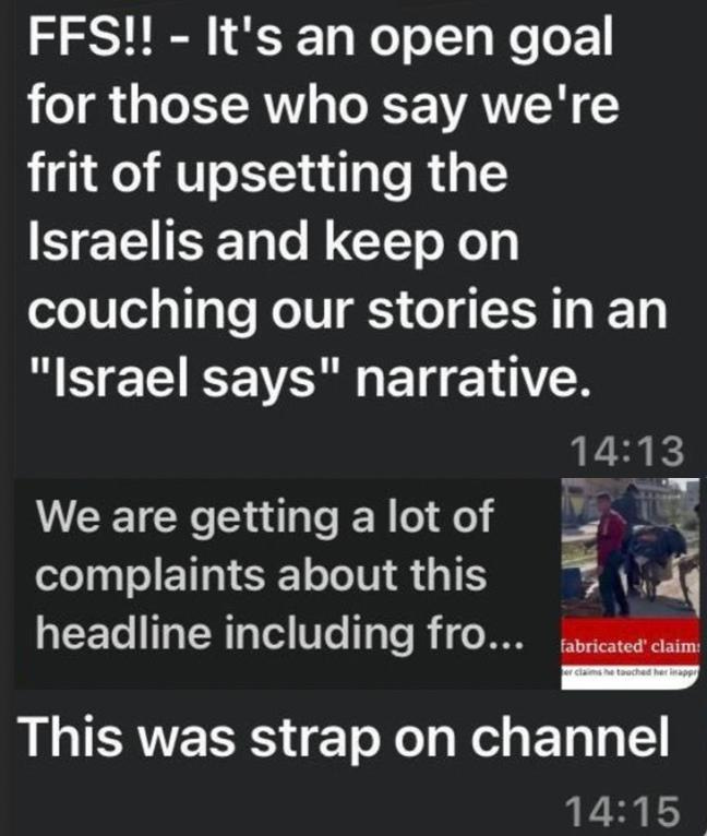 The internal critique peaked again in December, after journalists say the BBC failed to highlight Amnesty International’s report concluding that Israel is committing genocide against the Palestinian people in Gaza. Senior correspondents expressed their dismay at the angle chosen for the limited broadcast coverage. In a WhatsApp group of senior Middle East correspondents, editors, and producers—referred to as ‘the big dogs’ by BBC management—one posted the chyron during coverage on the BBC news channel: “Israel rejects ‘fabricated’ claims of genocide.” Another commented: ‘FFS!!—It’s an open goal for those who say we’re frit [afraid] of upsetting the Israelis and keep on couching our stories in an ‘Israel says’ narrative’. As one BBC journalist puts it to me: “These are established senior correspondents—and it’s even bothering them.”
