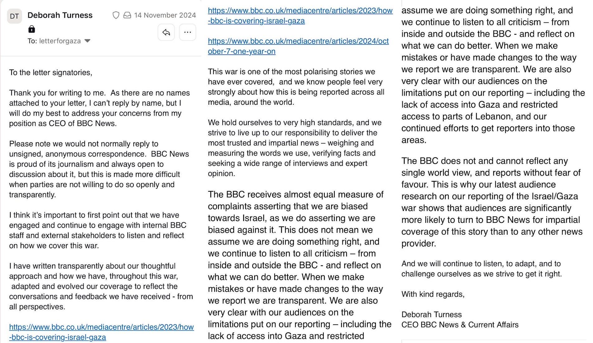 BBC management has rejected claims that such dissent has been ignored. In the reply sent by Deborah Turness, CEO of BBC News, which Drop Site News obtained, Turness told them to “please note we would not normally reply to unsigned, anonymous correspondence,” adding that “BBC News is proud of its journalism and always open to discussion about it, but this is made more difficult when parties are not willing to do so openly and transparently.” She claimed the BBC engaged with internal BBC staff and “external stakeholders” on coverage of Israel and Palestine, and argued “the BBC does not and cannot reflect any single world view, and reports without fear of [sic] favour.” One BBC journalist told me this reflected the BBC’s desire to “frame this as an identity politics issue, when it’s not. It’s about not blindly accepting the Israeli line.” Another called it “very patronizing.”