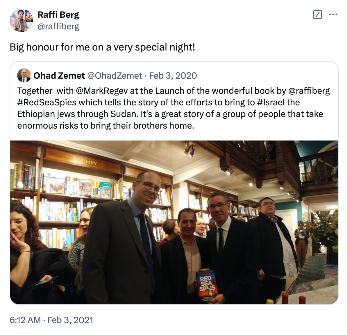 An expert on Mossad who requested anonymity out of fear of reprisal from within their professional circles told Drop Site News that the book failed to present crucial context surrounding Israel’s intelligence services, including their record of human rights violations, assassinations, and extraordinary renditions. Berg’s close relationship with Dani “raises the risk of adopting the viewpoints and value judgements of intelligence agencies,” the expert said, raising questions about Berg’s interest in the book’s subject. Books that romanticize the operations of spy agencies are “a powerful legitimizing device for intelligence services,” the expert said. “Authors who don’t even bother to raise tough questions about intelligence services are the best spokesperson these services could have hoped for. At the beginning of February 2020, Ohad Zemet, the spokesperson for the Israeli Embassy in London, attended a launch event for Berg’s book, where he posed for a photo with the author and Mark Regev, then Israel’s ambassador to the UK. Zemet posted the photo in a tweet in which he called the book “wonderful.” A year later, Berg retweeted Zemet’s post, with the words: “big honour for me on a very special night.”