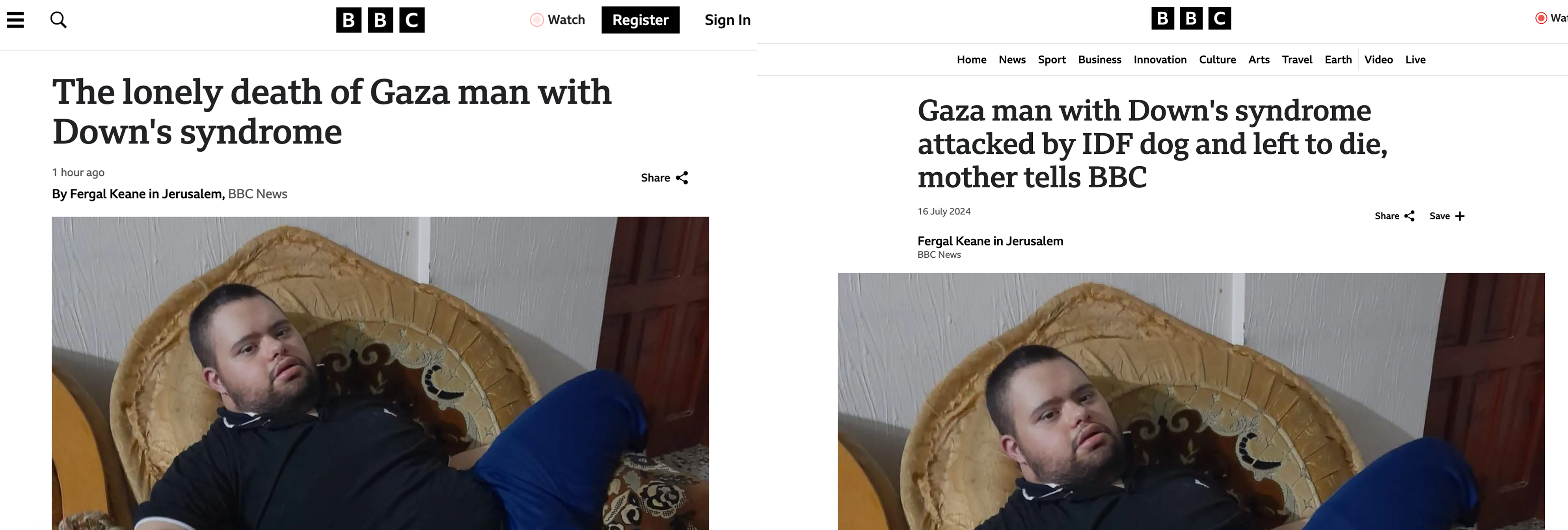 Bhar’s story was originally documented by Middle East Eye on July 12, with the headline: “Gaza: Palestinian with Down syndrome ‘left to die’ by Israeli soldiers after combat dog attack.” British newspaper The Independent covered it with the headline: “Gaza man with Down’s syndrome mauled by Israeli attack dog and left to die, family says.” Four days later after the first reports, the BBC published its own version of the story. Its headline: “The lonely death of Gaza man with Down’s syndrome.”